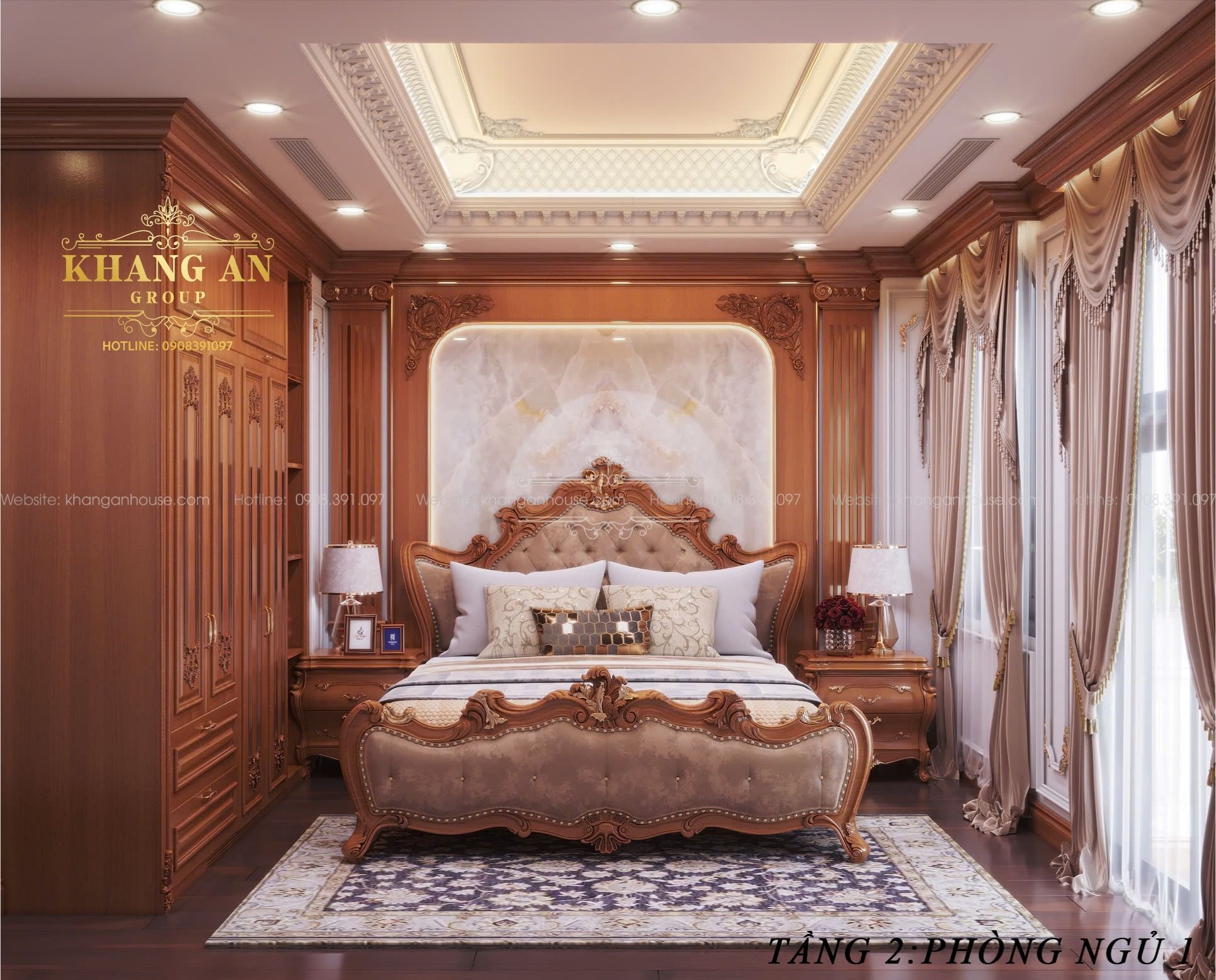 Toàn bộ nội thất từ tủ quần áo, kệ tivi, bàn trang điểm, táp đầu giường… đều được thiết kế đồng bộ, tạo ra sự thống nhất hoàn hảo. Giường ngủ được đặc biệt chú trọng trong thiết kế để nâng niu giấc ngủ trong mỹ cảm thượng lưu với nệm bọc rút cúc theo phong cách Louis, kết hợp những hoa văn chạm khắc cầu kỳ. Trên nền tảng chung ấy, mỗi phòng ngủ lại có những đặc điểm riêng phù hợp với sở thích, cá tính, thói quen, độ tuổi của chủ nhân căn phòng.
