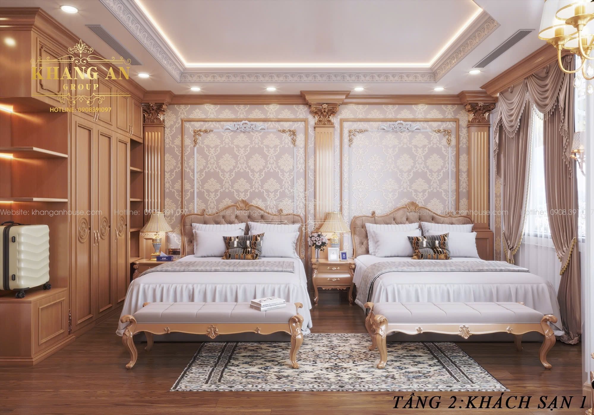 Thay vì gỗ màu cánh gián như phòng ngủ gia đình, các phòng khách sạn chọn tông gỗ tươi sáng và nâu trầm. Tường được trang trí bằng giấy dán hoa văn Damask, kết hợp phào chỉ màu trắng hoặc vàng ánh kim, để tạo điểm nhấn trang nhã. Đồ nội thất vẫn giữ phom dáng cổ điển nhưng các chi tiết điêu khắc được tiết chế hơn so với phòng ngủ gia đình, hướng tới vẻ đẹp thanh lịch, tinh tế mà sang trọng. Vật liệu được chọn lọc kỹ, từng chi tiết hoàn thiện tỉ mỉ, đem lại trải nghiệm lưu trú sang trọng, thoải mái.
